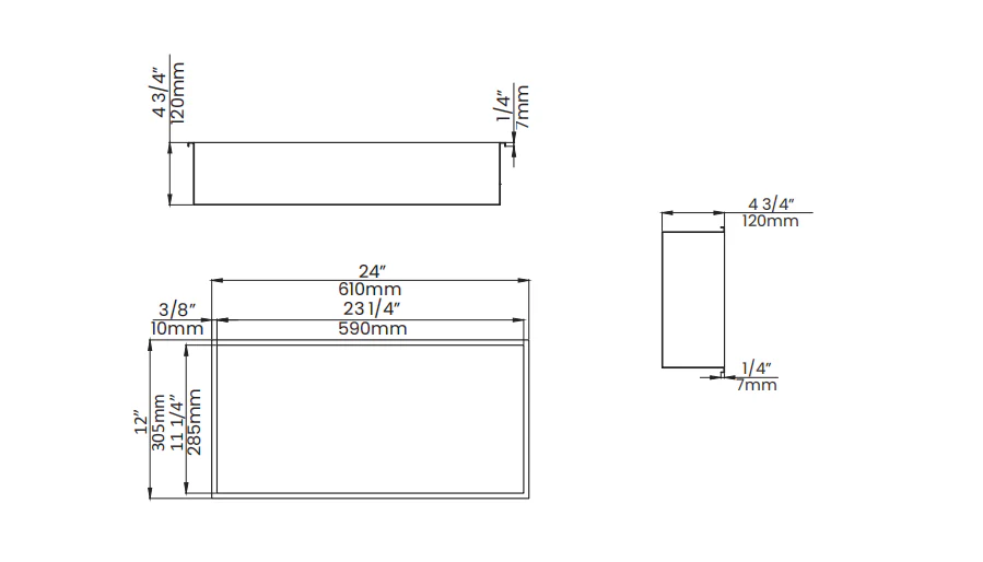 - Length:24“(610mm), Width: 12” (305mm), Height: 4 3/4” (120mm)
