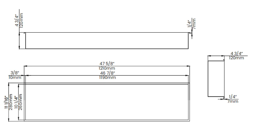 - Length:475/8” (1210mm), Width: 11 1/16” (280mm), Height: 4 3/4” (120mm)