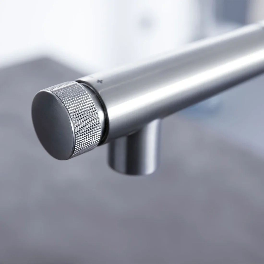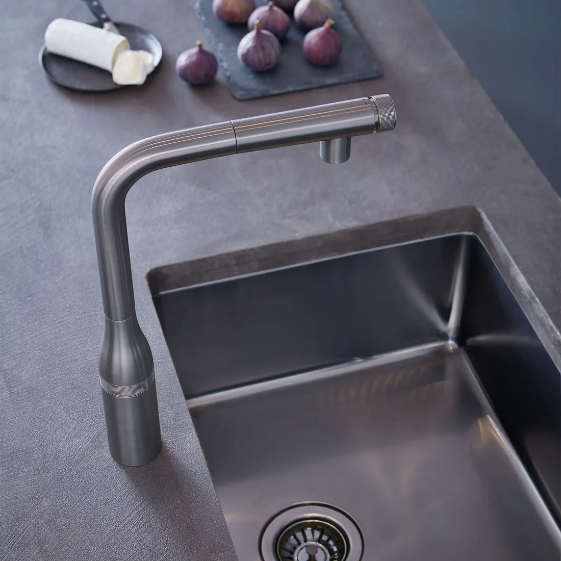 The GROHE Essence SmartControl Kitchen Faucet makes everyday tasks effortless. Equipped with the exclusive GROHE SmartControl button at the tip of the pull-out spout, it allows for easy push-button on/off and hands-free convenience. Distinctly different, the water temperature is controlled by turning the knurled dial at the base of the faucet. Meticulously crafted with no lever to regulate or handles to fine-tune, this sleek, streamlined kitchen faucet makes a lasting impression.