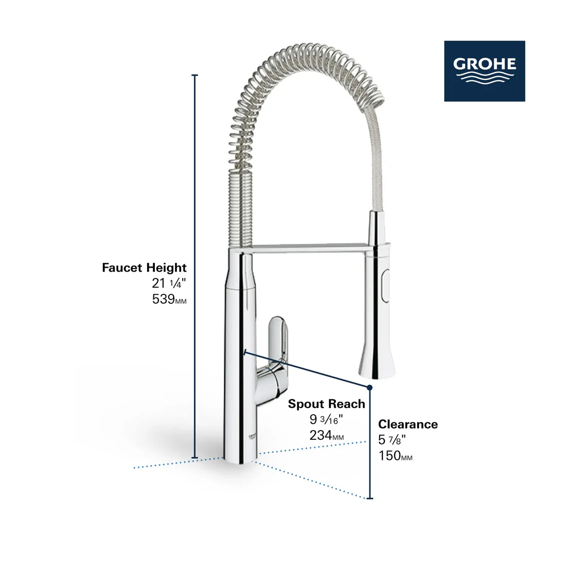 The K7 Single-Handle Semi-Pro Dual Spray Kitchen Faucet from GROHE is durable, dependable, and designed to give your kitchen a professional look without overpowering. Spring arm provides an extensive operating radius within the sink and swivels 360° for added versatility in a center island. Medium high spout and dual spray functions make every kitchen task easier, from filling pots to cleaning the sink and rinsing vegetables.