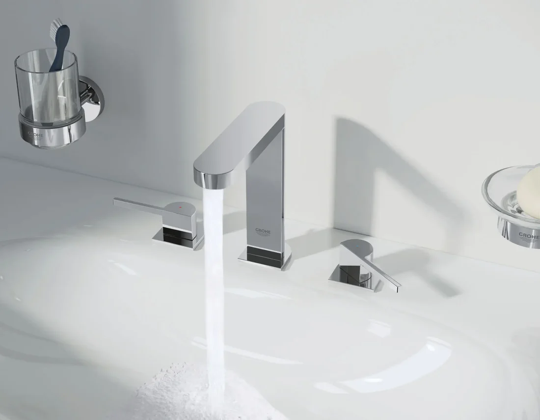 Elegant or minimalist, the GROHE Plus Wideset Bathroom Faucet combines the clean, linear angles of a cube with the gentle curves of a circle making it a distinctive choice no matter the design aesthetic. Engineered to bring comfort and convenience to your bathroom, the Plus Wideset Faucet features the durable GROHE StarLight coating for easy care and lasting beauty.