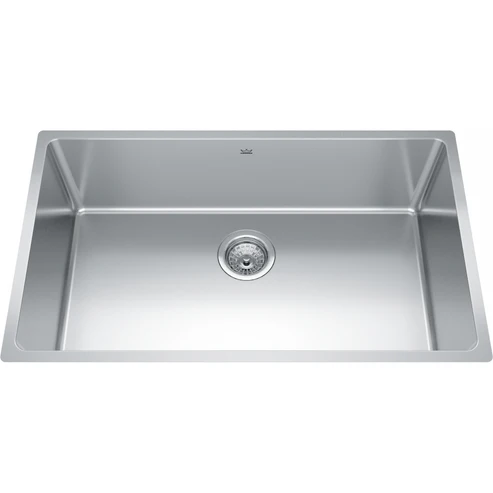 Brookmore Collection 30.6-in x 18.2-in Undermount Single Bowl Stainless Steel Kitchen Sink. The Brookmore stainless steel sink collection will create something truly unique that fits both prepping and cleaning needs. Made with high-quality 18-gauge stainless steel with a rich chromium content that helps shield the material from corrosion and prevents bacterial growth. The undermount sink style provides a sleek, modern look and makes cleaning up spills and messes easy. The spacious 9″ deep bowl is perfect for soaking and washing stacks of dishes, and the sound-dampening system goes to work to reduce the noise caused by a garbage disposal or running water.