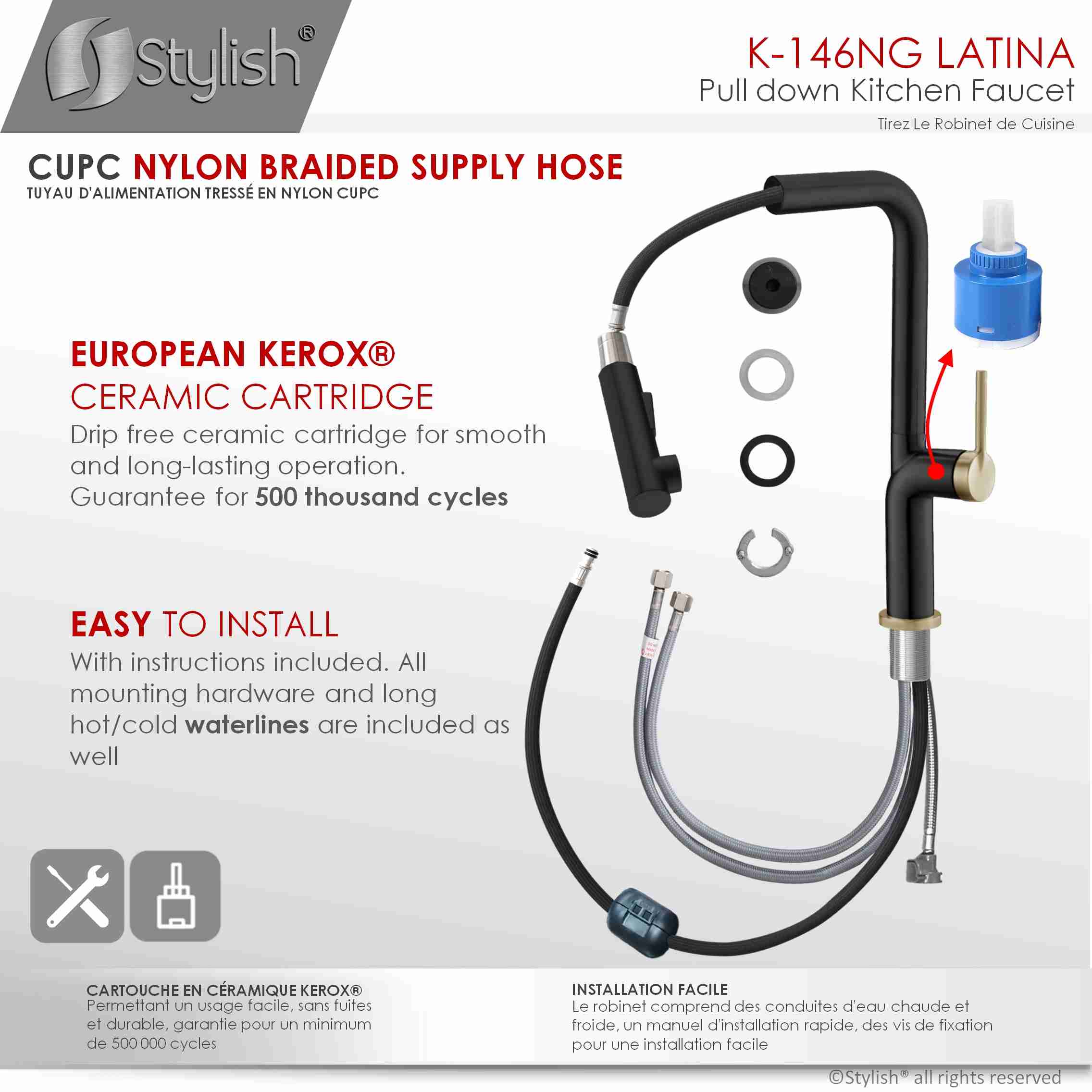 Stylish® K-146NG Single Handle Pull Down Kitchen Faucet – Matte Black with Brushed Gold Finish