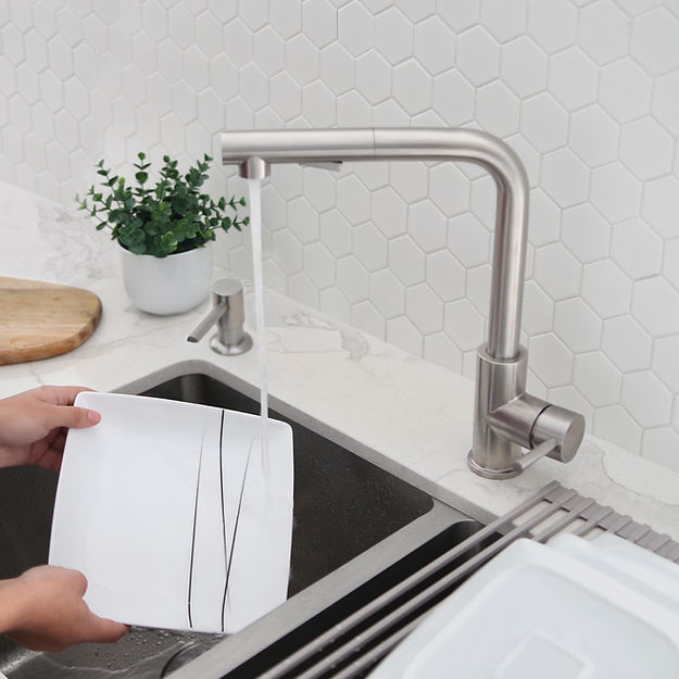 Both kitchen faucet and soap dispenser are designed to meet the highest plumbing standards in North America. Made from 100% stainless steel and top-quality components, they are engineered to ensure quality and longevity. This pull out single handle kitchen faucet is extra durable and will not rust or corrode.