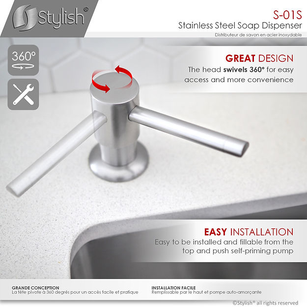 The sink soap dispenser pump swivels 360 degree for easy access. The sturdy and durable construction will provide many years of use. It is also very easy to install.