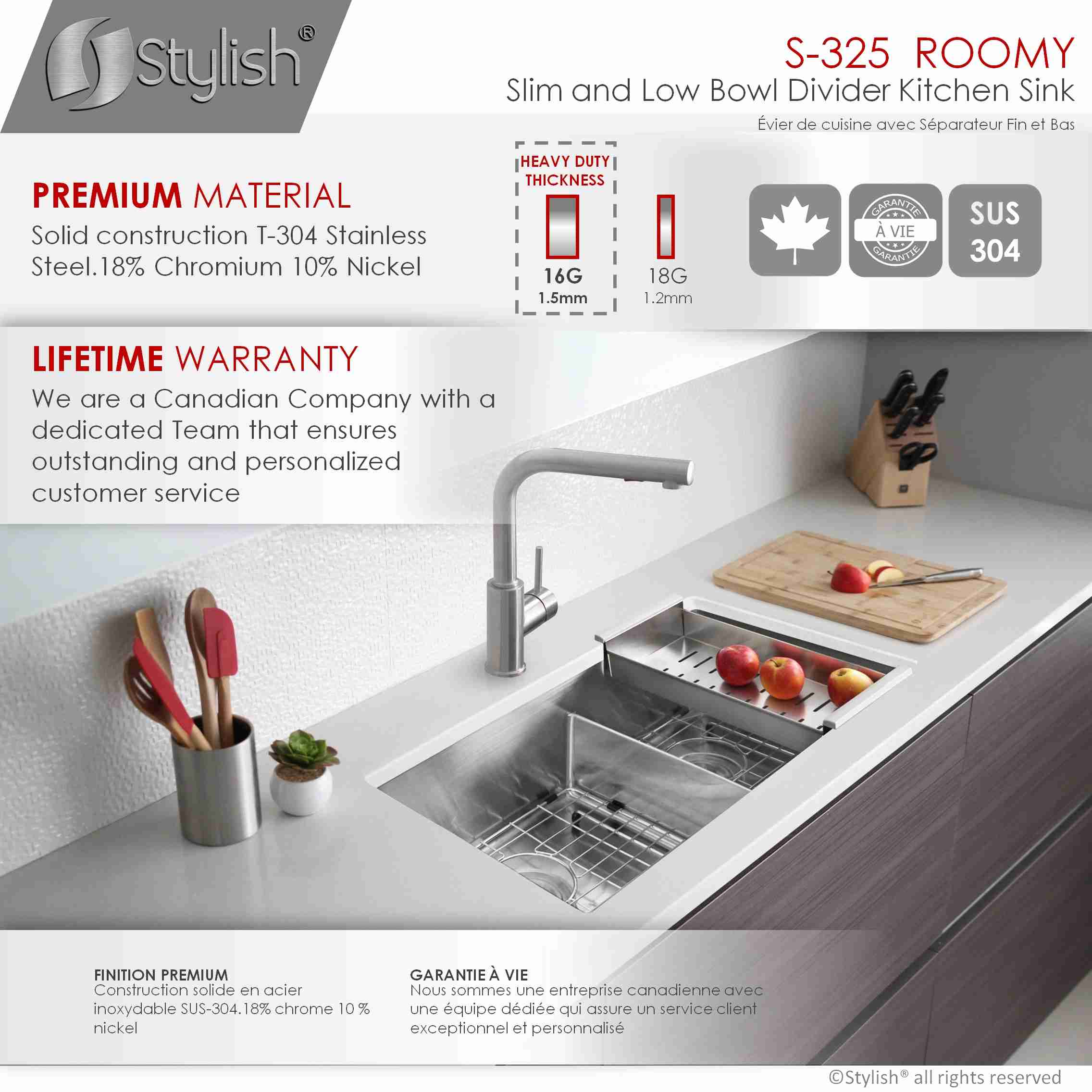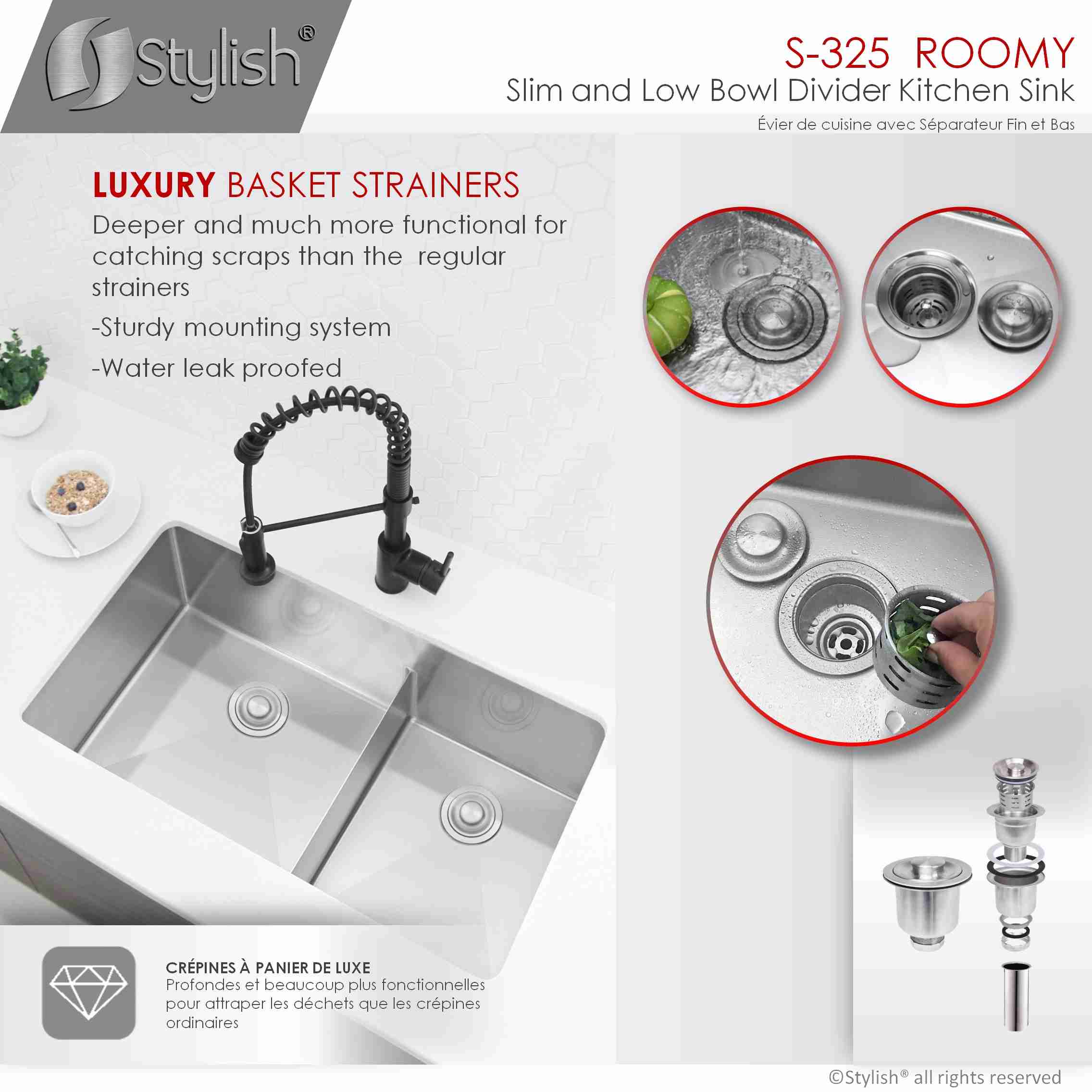 Enhance your kitchen with the Stylish® S-325XG Roomy, a 60/40 double bowl stainless steel kitchen sink featuring a slim low divider. This innovative design offers the functionality of a double bowl sink without the inconvenience of a high divider, making it easier to rotate large pans and bakeware between bowls.