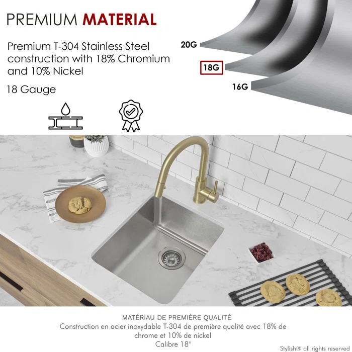 - Made from premium materials, this sink features a composition of 18% Chromium and 10% Nickel, providing impressive resistance to corrosion and stains.
