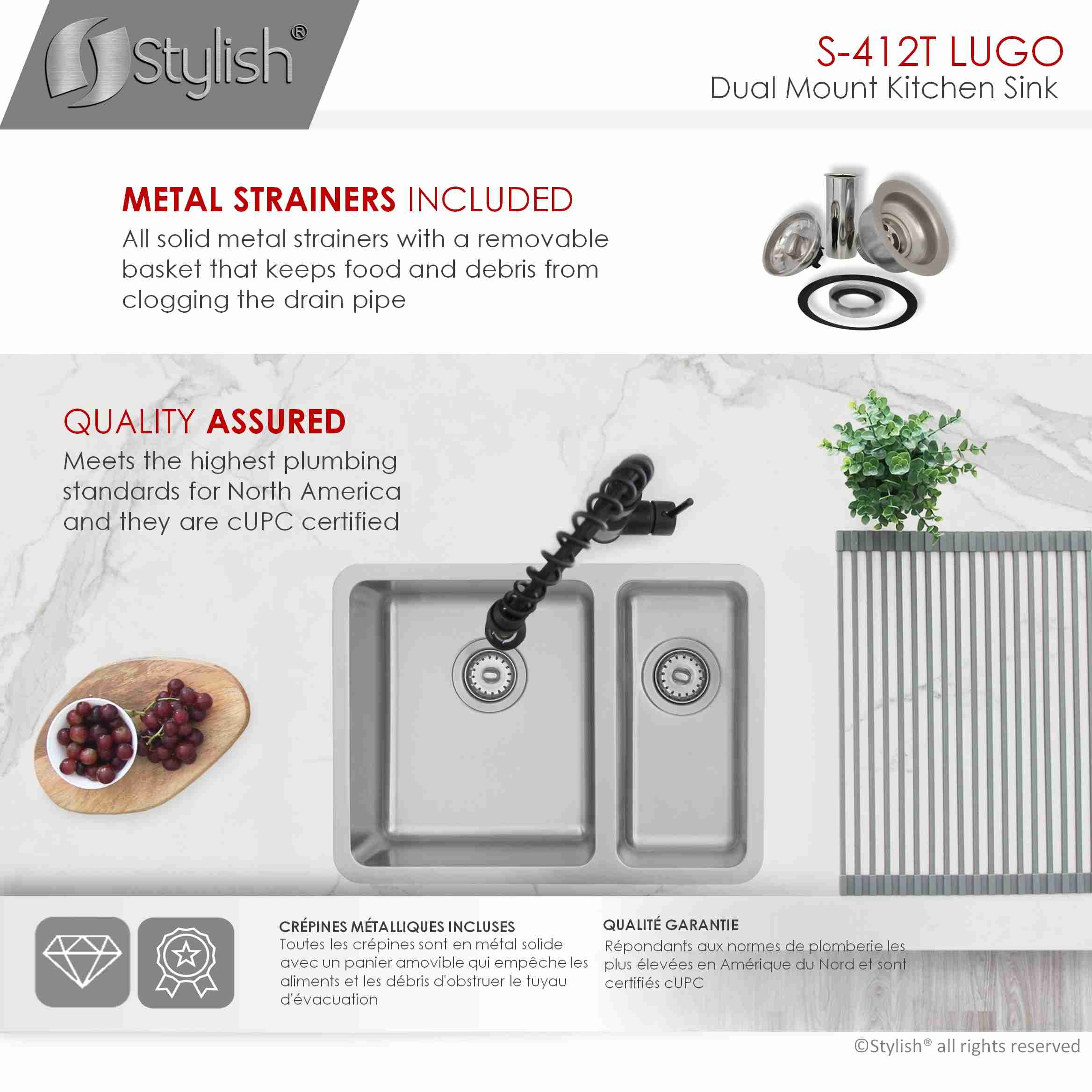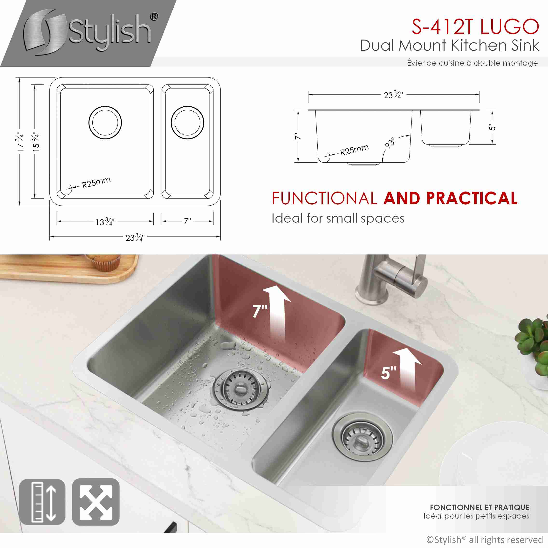 Meet our newest sink: the Stylish® S-412T Lugo 23-inch Dual Mount Double Bowl Kitchen Sink. This sink combines style and functionality in one elegant package. Featuring 70/30 bowls, it allows you to use the larger bowl for bigger items while utilizing the smaller bowl for drying dishes or defrosting. This design is perfect for your new kitchen or any renovation project.