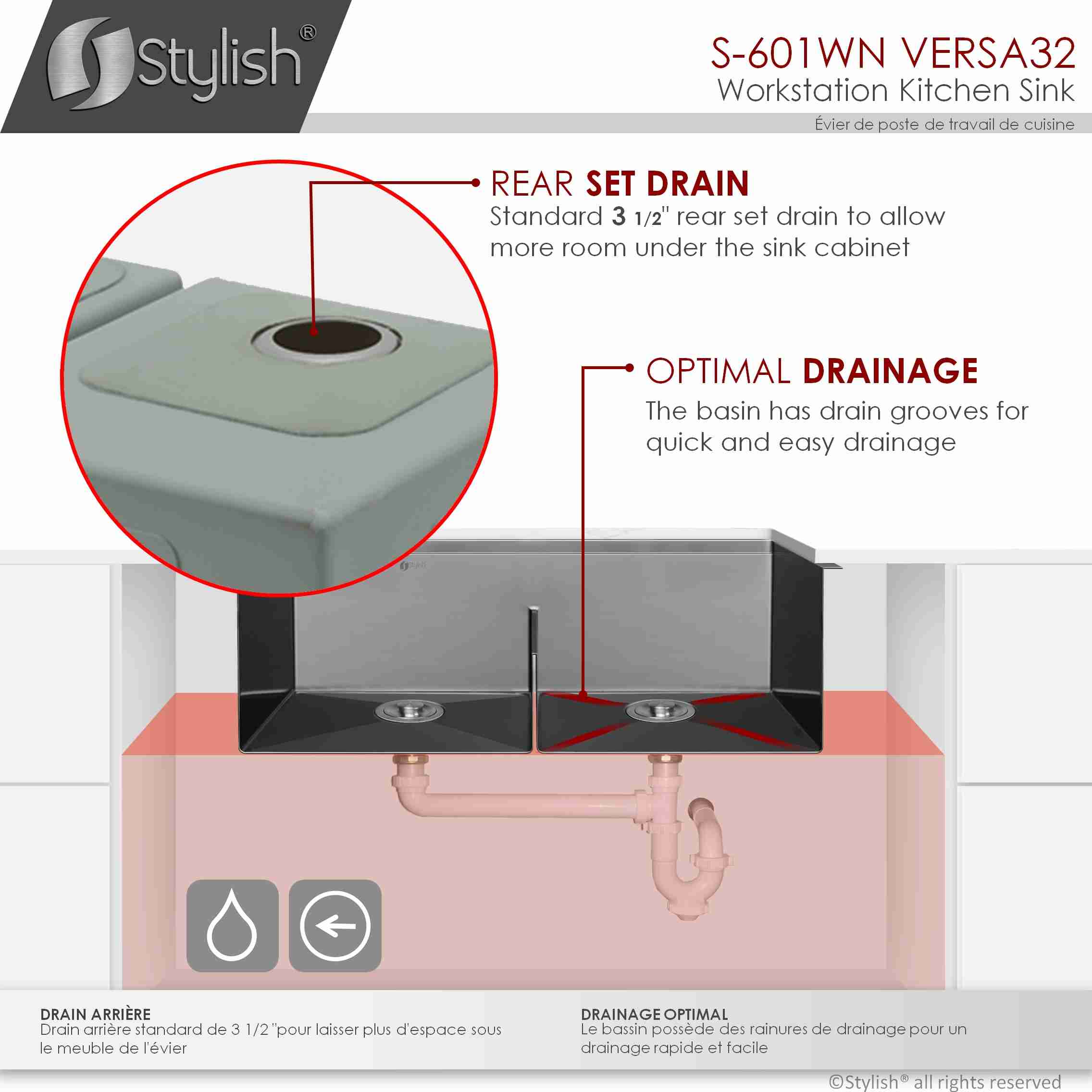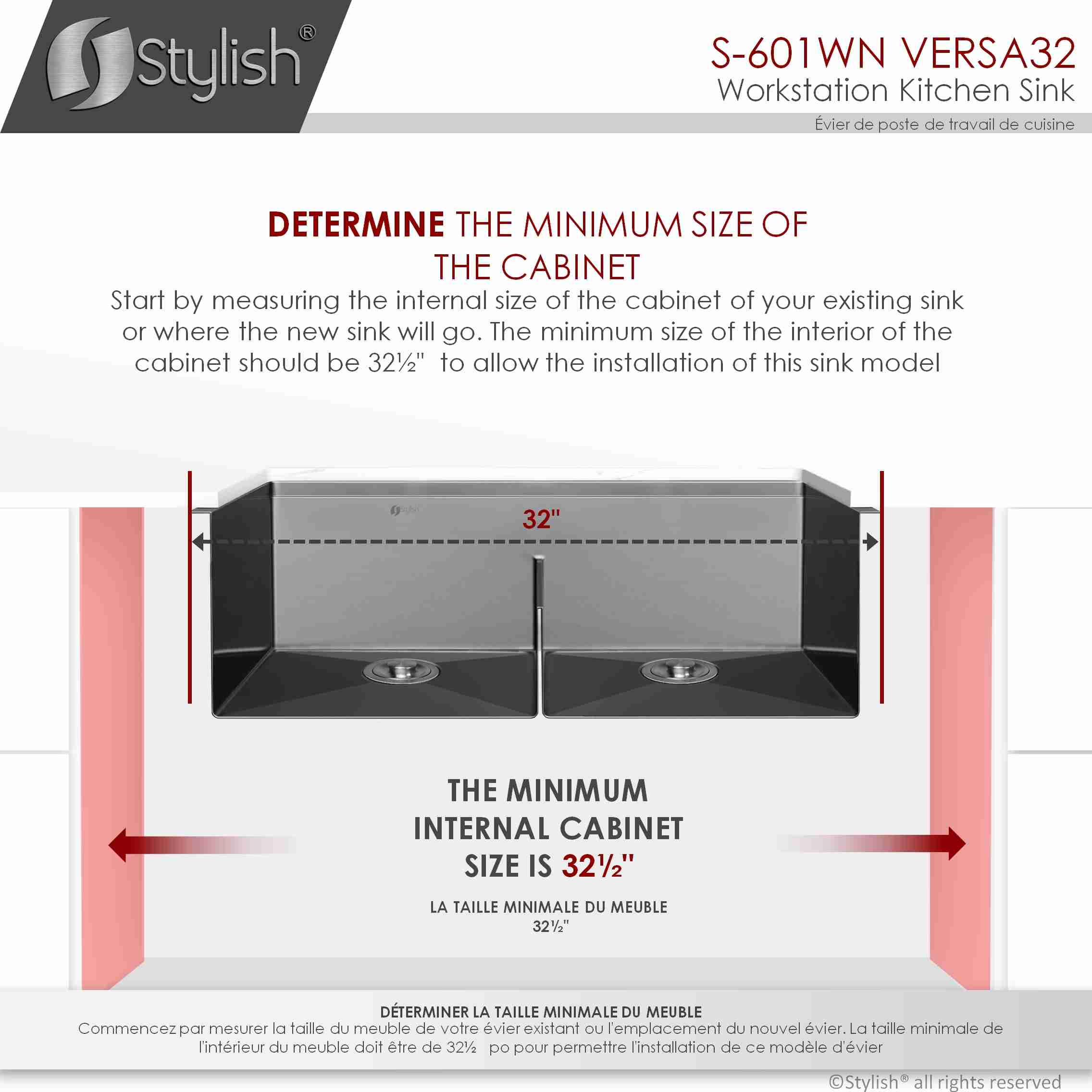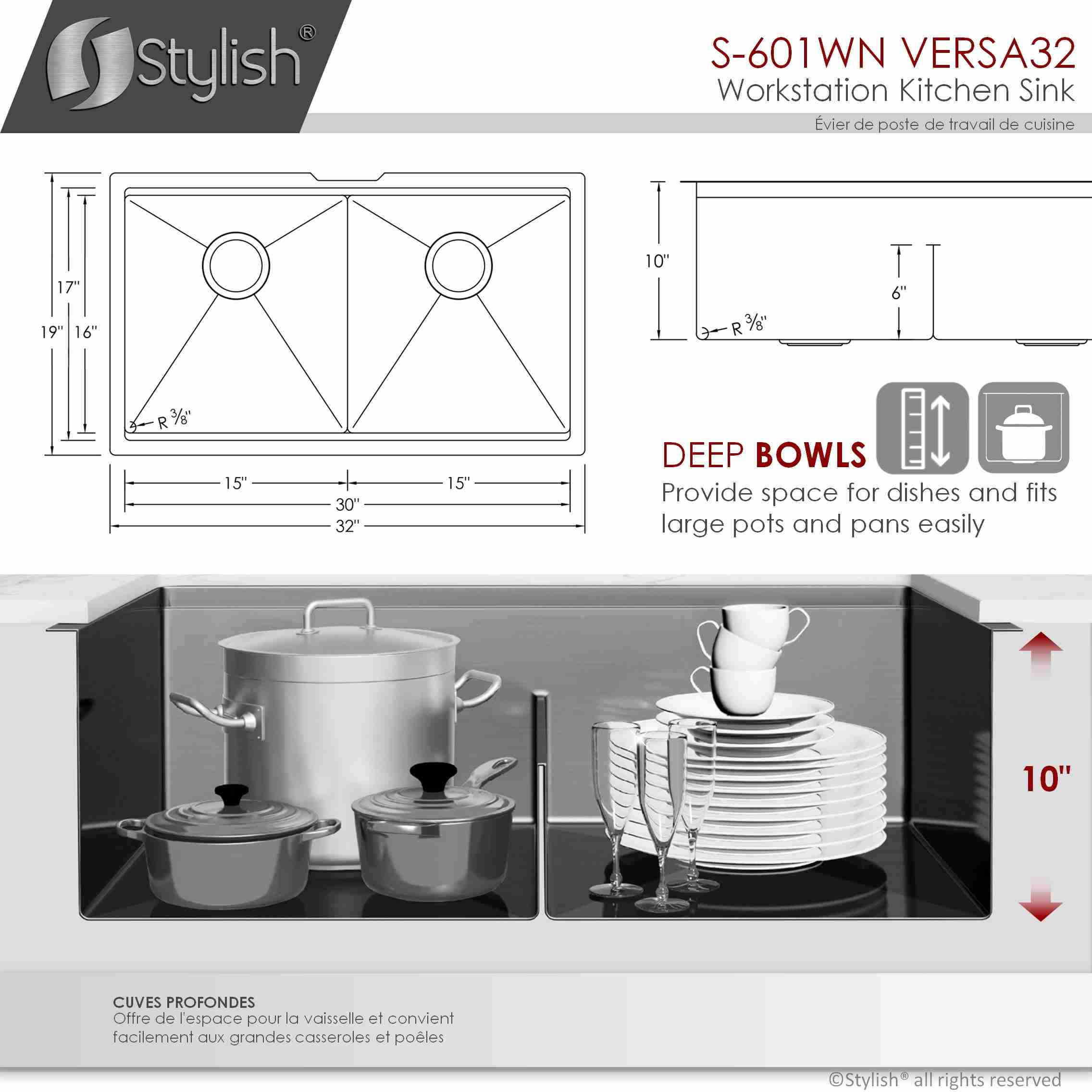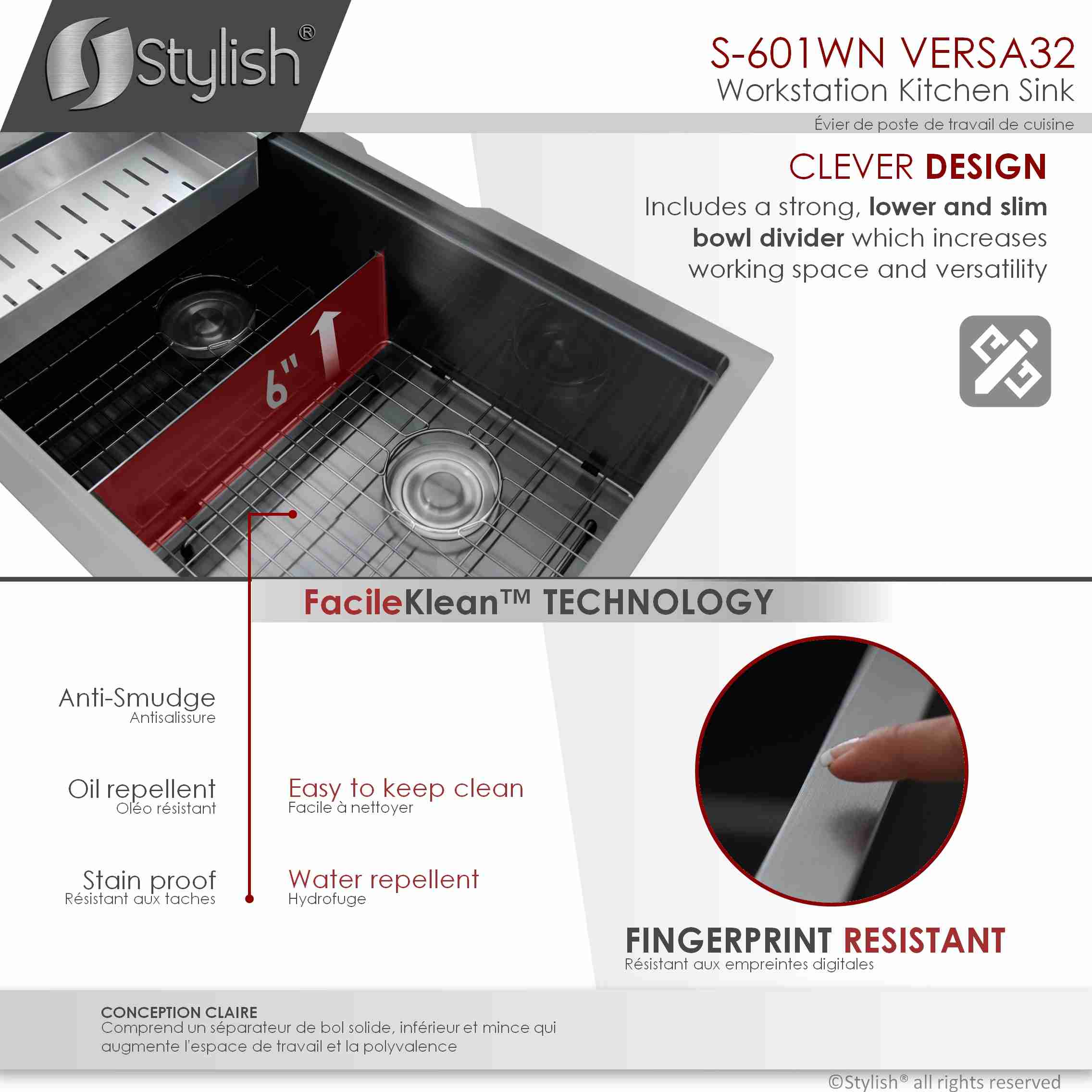 The Stylish® S-601WN Versa32 is a stunning 32-inch workstation double bowl undermount kitchen sink that brings together style and functionality. It features a slim and low divider for convenient space utilization, complemented by built-in accessories that slide on integrated tracks to streamline meal prep and cleanup without sacrificing valuable counter space.
